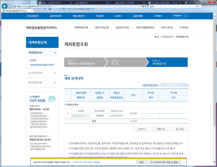1금융권에서는 특이사항이 없어서 저축은행/상호금융/우체국으로 해서 다시 한번 계좌통합조회를 수행해봤는데 농축협에 해당하는 건 제가 알고있는건데 우체국이 하나 나오네요.