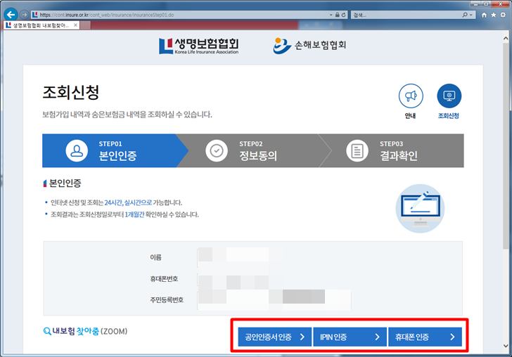 숨은 보험금 조회하기를 클릭하셨으면 그 다음 화면에서 본인인증을 해야합니다. 이름, 휴대폰번호, 주민등록번호를 입력하고 공인인증서, 아이핀, 휴대폰 중 하나를 선택하셔서 본인인증을 하시면 됩니다.