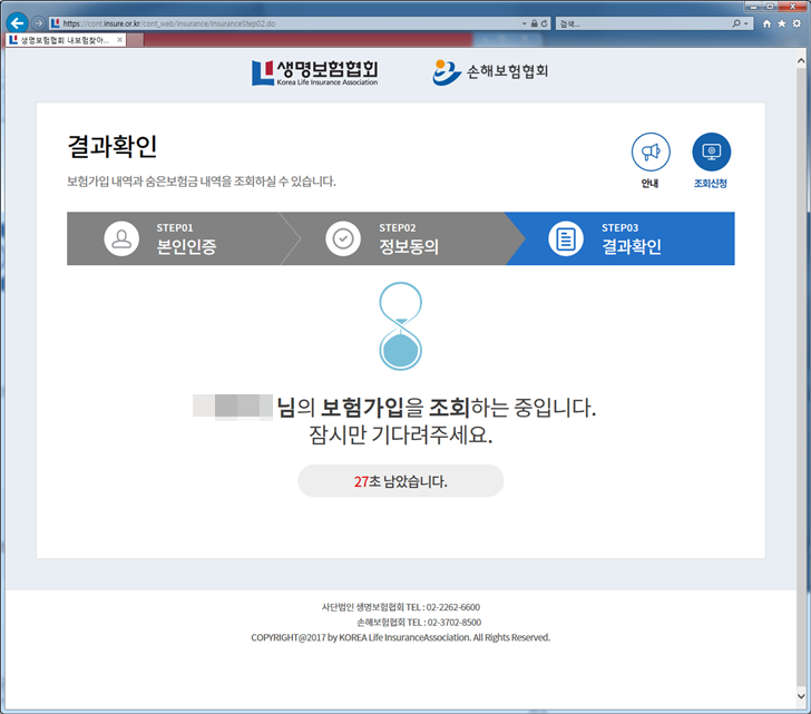 고객정보활용동의를 하면 내보험 찾아줌 시스템에서 보험가입을 조회를 시작합니다. 보험가입 조회는 약 30초정도가 소요되며 잠시동안 기다리면 보험가입 내역에 대한 결과를 확인하실 수 있습니다.
