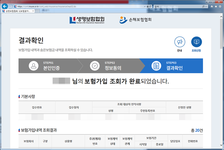 보험가입내역 조회가 완료되면 아래와 같이 보험가입 내역과 숨은 보험금 내역을 조회하실 수 있습니다. 저의 경우 보험가입내력 조회결과에 총 20건의 보험가입내력이 있네요.